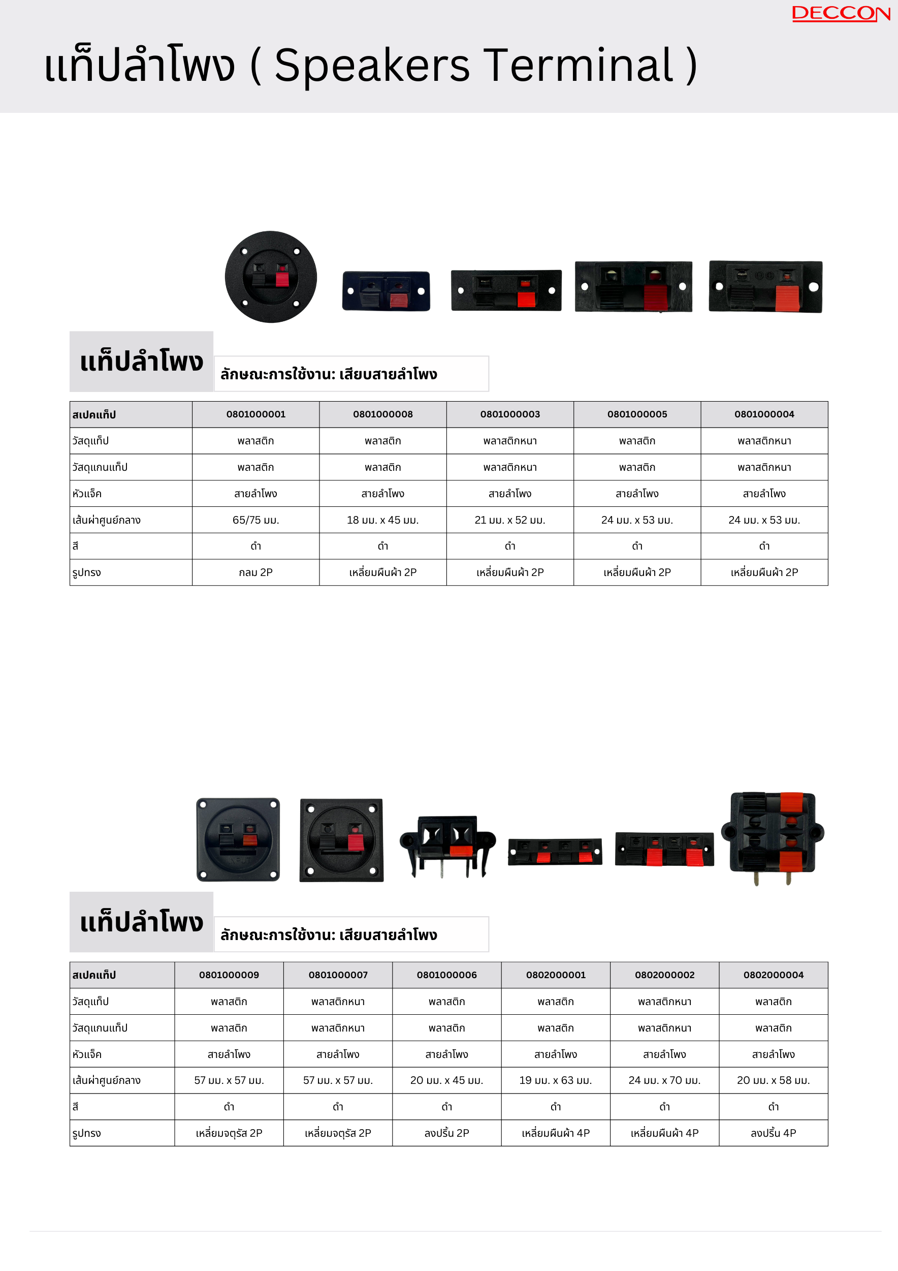 แท็ปลำโพง (Speaker Terminal) คือขั้วต่อที่ใช้เชื่อมต่อสายลำโพงกับอุปกรณ์เสียงต่างๆ เช่น ลำโพง หรือเครื่องขยายเสียง ให้การเชื่อมต่อที่มั่นคงและปลอดภัย เหมาะสำหรับงานติดตั้งระบบเสียงที่ต้องการคุณภาพเสียงที่ชัดเจนและเสถียร